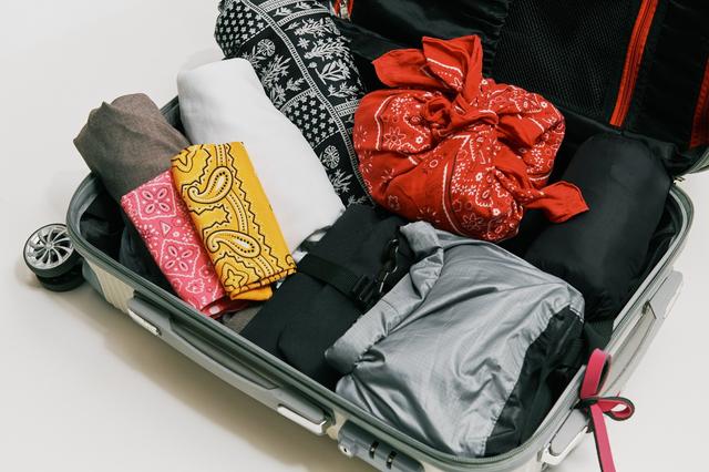 編集部K「風呂敷は、下着や靴下などを色別に分けて包んでいます。中に物を入れてぎゅっと結べば、しっかりまとまりますし、汚れ物を包んでそのままキャリーに入れることも。また、キャリーに結んでおけば、目印としても使えます」
