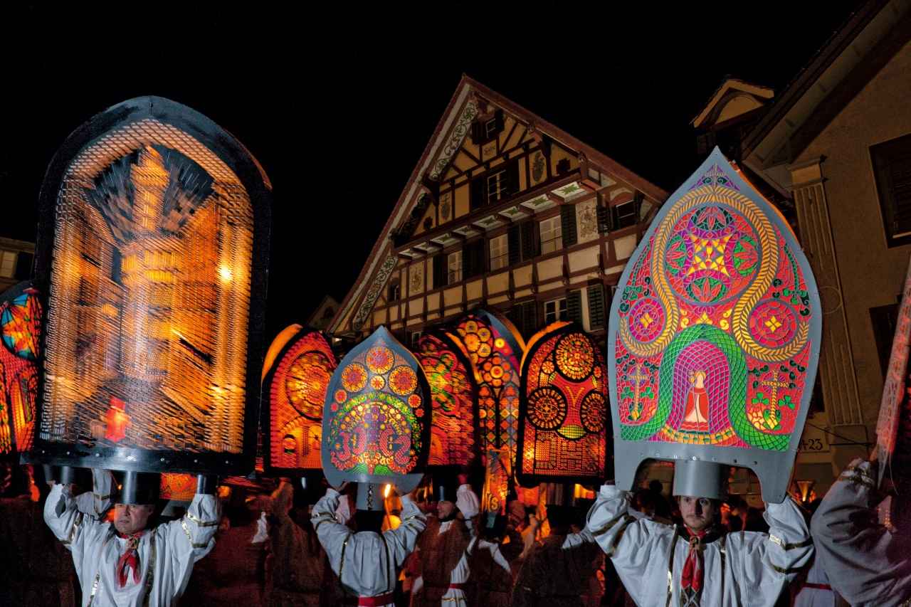 「毎年数万人が見学に訪れる有名伝統行事なだけあり、見どころがたくさん! 角笛や金管楽器、大きなカウベルをにぎやかに鳴らし、鞭打ちの儀式などが行われますが、特に必見なのは精巧で美しく切り絵の装飾がされた『イフェレ(司教冠)』のランタン行列。私たちを夢幻の世界へと誘います」(スイス在住ライター・小島瑞生さん)