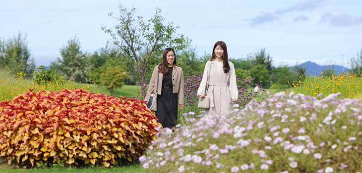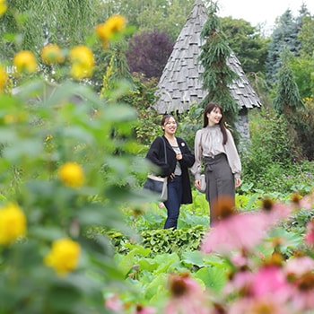 約1.3ヘクタールの敷地に2,000種類以上の草花が植えられている「上野ファーム」。この土地の気候風土に合う植物を選んで丹精込めて手入れされた庭は、イングリッシュガーデンとも違う“北海道ガーデン”。春から秋まで、日ごとに表情を変える景色を楽しめ、フォトスポットもたくさんあります。訪れた時季はダリアやエキナセアといった夏の名残りの花々と、風に揺れるグラス(草)、赤く色付いたカンボクの実などが見頃で、秋が深まっていく美しい北海道を満喫できました。