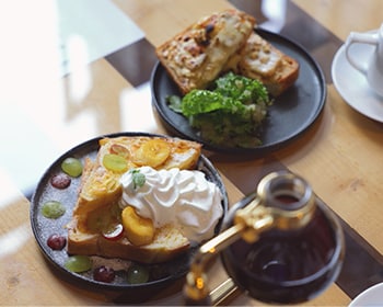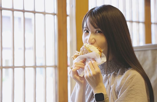 サイクリングの途中で気になる和カフェを発見。古い建物をリノベーションした店内は木の温もりが感じられて素敵です。たい焼きのように型で焼く「トキワ焼き」のホイップサンドをオーダーして、ほっとひと息つきました。心地よく疲れた体に、やさしい甘さがしみます。