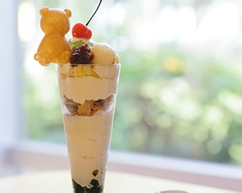 ケーキセット、くまさんパフェなどカフェメニューも充実。スイーツ好きの私たちには夢のようなお店です。