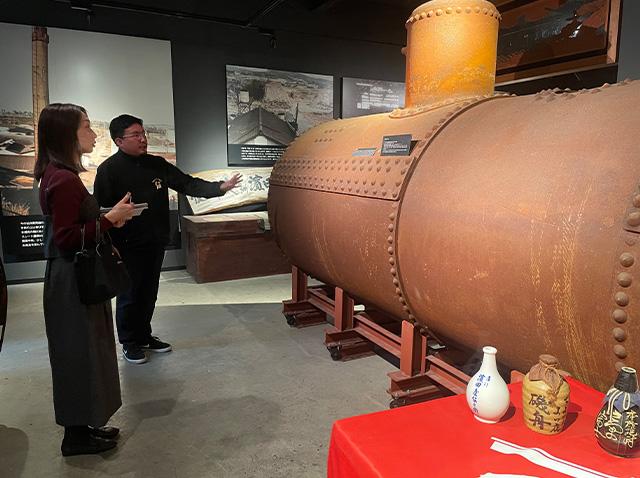 伝兵衛ミュージアムでは、150年以上にわたる焼酎造りの歴史を伝える道具を展示しています。また、焼酎造りの過程で生じる熱湯を再利用し銭湯を経営していたというエピソードなども伺えました。