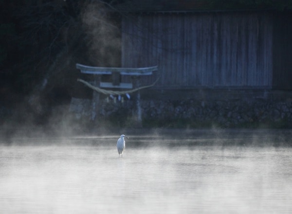 清水と温泉が流れ込み水温が高いと言われ、冬の早朝には湯気が立ち上る幻想的な光景を見ることができます。