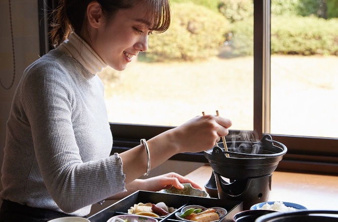 宿の名物は美味の詰まった会席料理「由布岳雲海鍋和膳」。