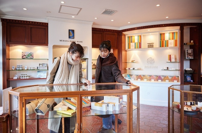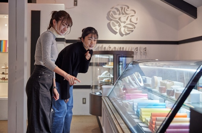 白壁に囲まれた落ち着きある空間に佇むのはショコラショップ『théomurata(テオムラタ)』や、カフェ『thé théo(テテオ)』。