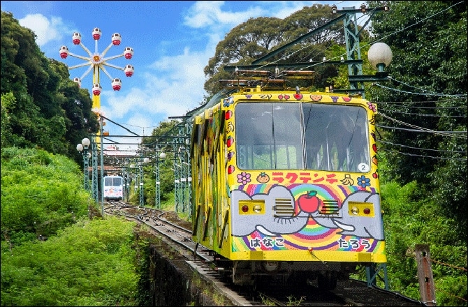 1929年(昭和4年)開通、勾配30度という日本屈指の急勾配を誇るケーブルカーはラクテンチの名物的存在です。